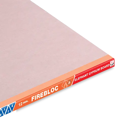 FireBloc gypsum board encased with a specially designed compressed pink paper consisting of special fiber components that enhances its strength. Capable of fire resistance rating from 1 to 4 hours. FireBloc gypsum board can be applied to all areas of house, office, or industrial buildings wherever fireproofing is needed.