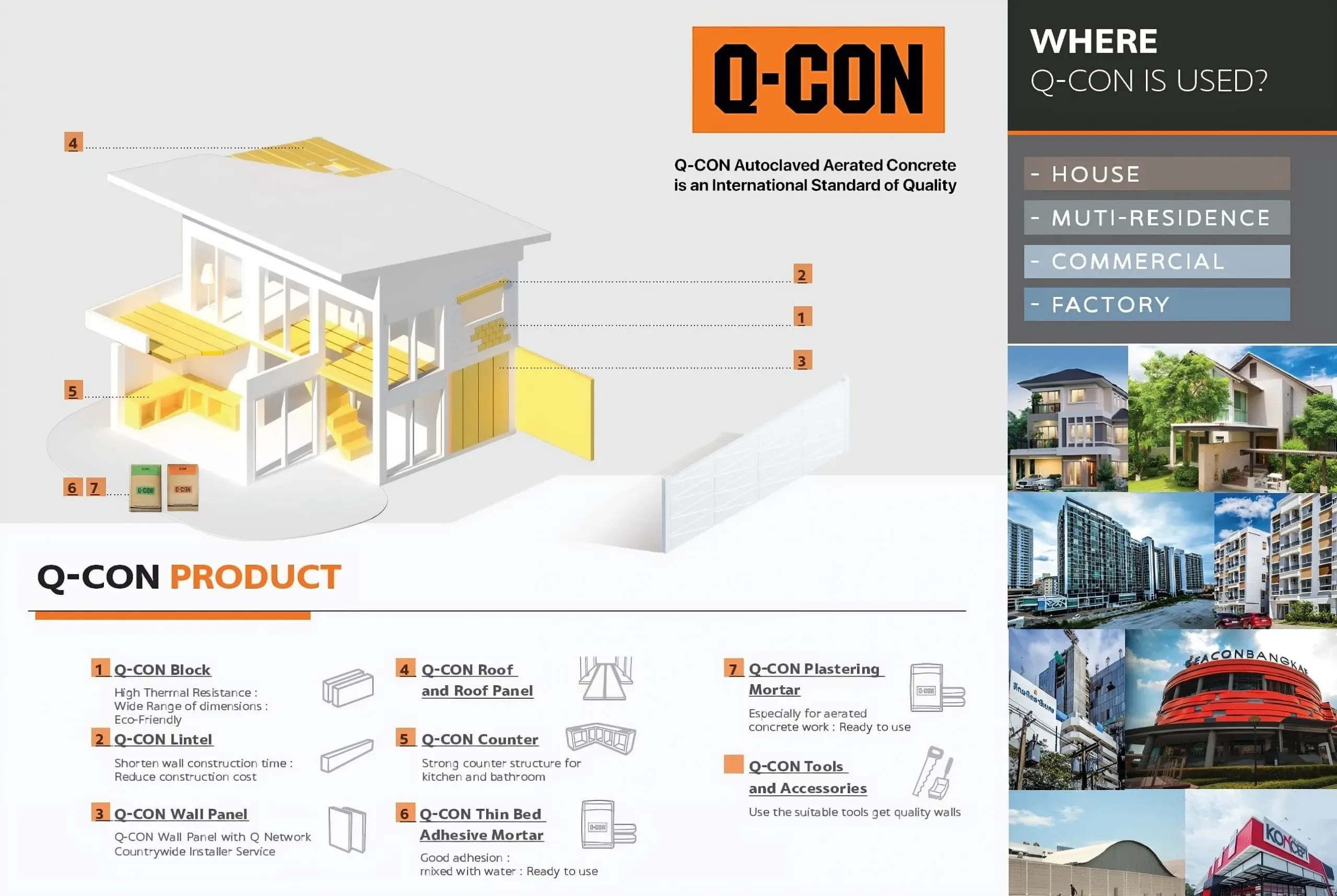 Q-CON, established in 1994, is located on 55 rai of land in Bang Pa-in Industrial Estate. Phra Nakhon Si Ayutthaya. Produces autoclaved aerated concrete with advanced production technology from Germany. Our